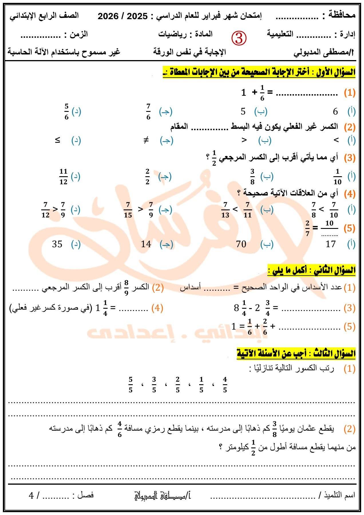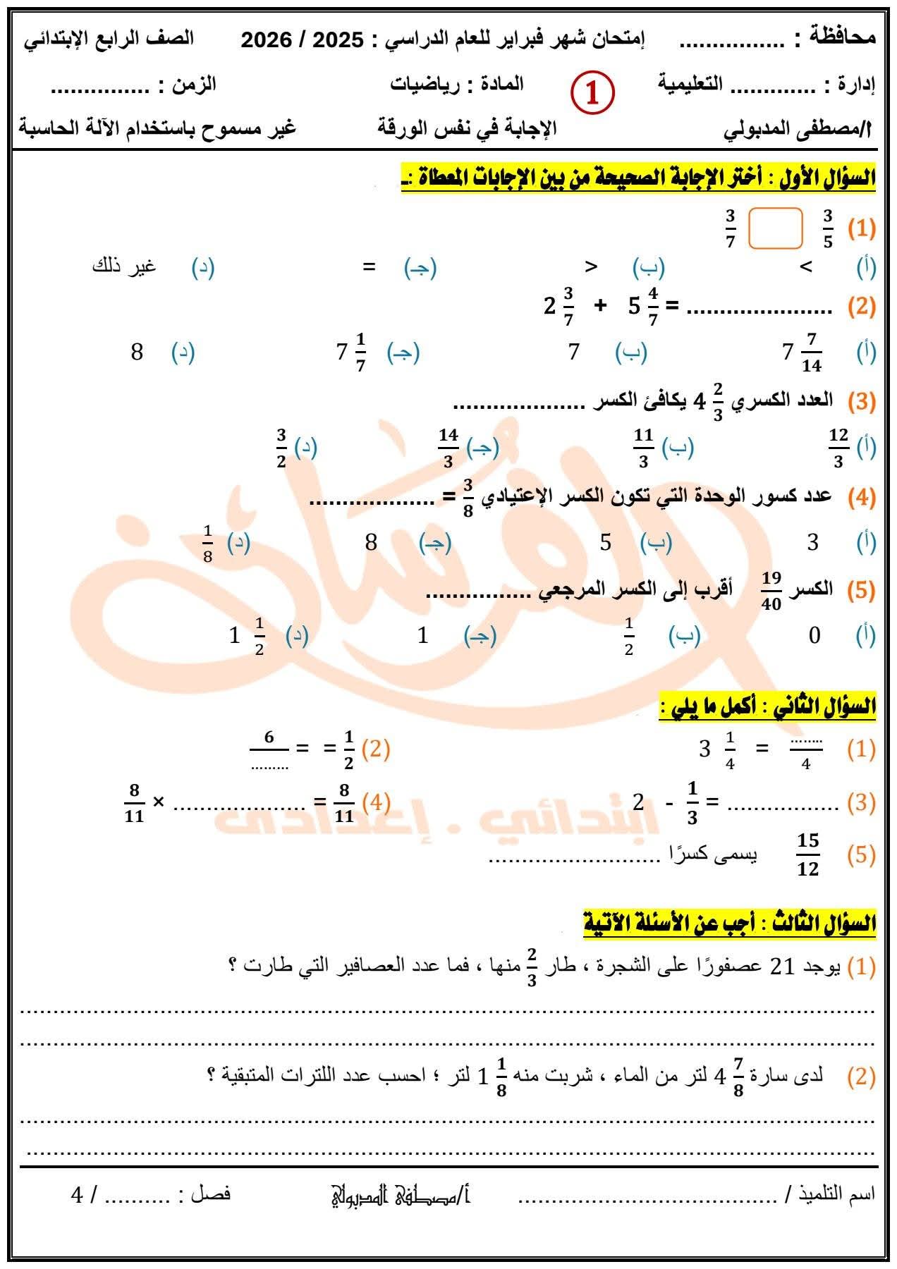 تنزيل نماذج امتحانات رياضات للصف الرابع الابتدائي الترم الثاني 2026.. بالتزامن مع بدء امتحانات شهر مارس الجاري في عدد من المحافظات، يبحث كثير من الطلاب عن نماذج امتحانات رياضات للصف الرابع الابتدائي الترم الثاني 2026 وكان قد بدأ طلاب صفوف النقل من الصف الثالث الابتدائي وحتى الصف الثاني الثانوي، امتحانات شهر مارس الجاري في عدد كبير من المحافظات.