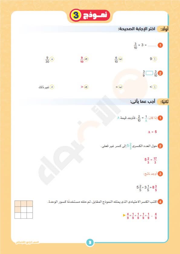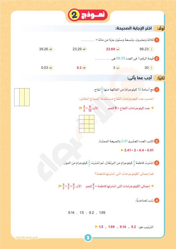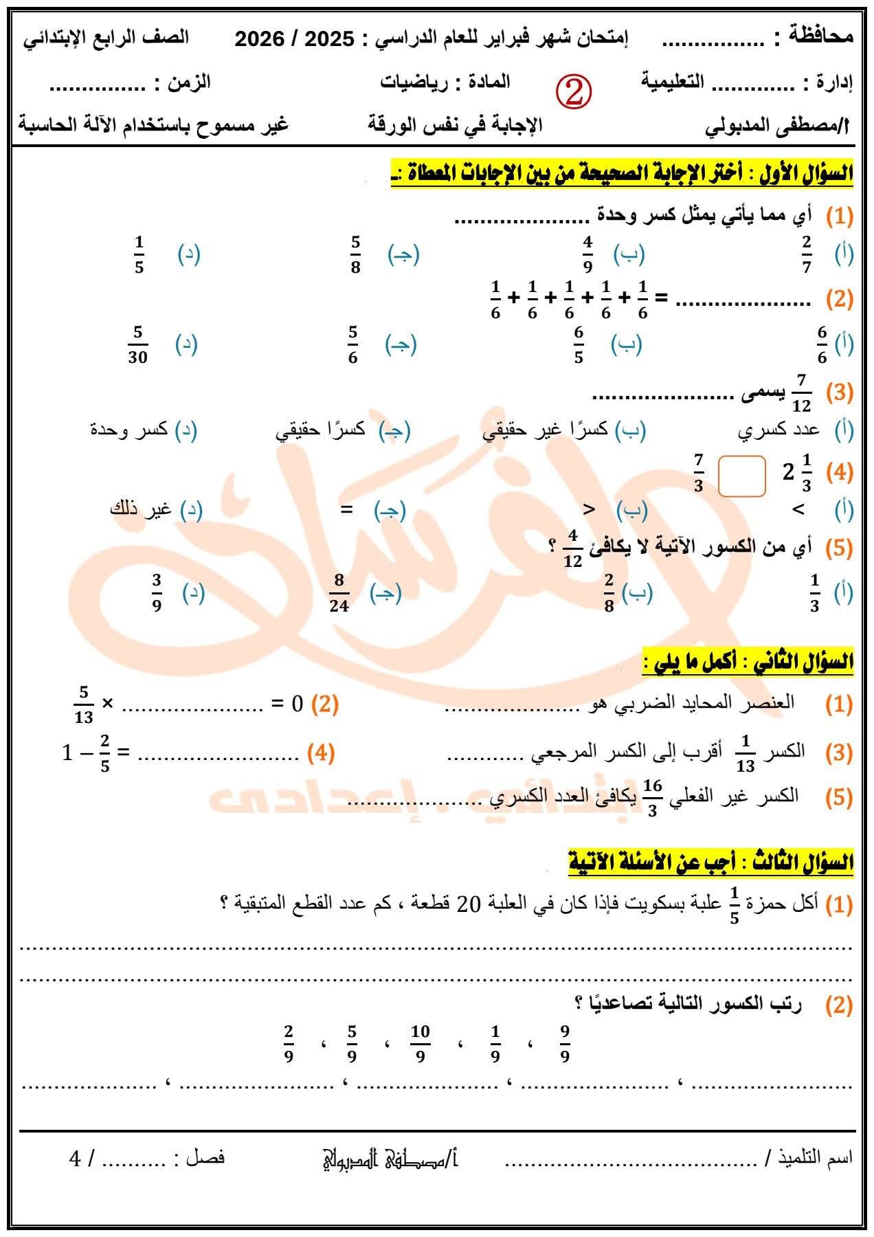 نماذج امتحانات رياضيات الصف الرابع الابتدائي الترم الثاني